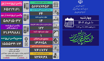 از دیروز تا امروز ۱۰ خردادماه ۱۴۰۲ و بر اساس معیارهای قطعی تشخیصی، ۲۴ بیمار جدید مبتلا به کووید۱۹ در کشور شناسایی و ۱۴ نفر از آنها بستری شدند.