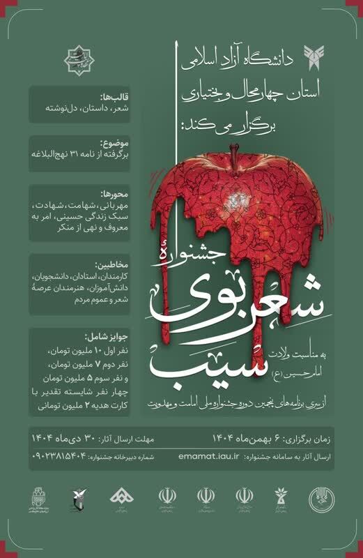 به گزارش خبرگزاری صدا و سیما مرکز چهارمحال و بختیاری، بابک کیوانی گفت: این جشنواره از سری برنامههای پنجمین دوره جشنواره علمی فرهنگی امامت و مهدویت دانشگاه آزاد اسلامی با هدف ترویج فرهنگ غنی امامت و مهدویت و ایجاد فضای مناسب برای تبادلنظر و ارائه آثار فرهنگی و هنری ۱۳ بهمن ۱۴۰۴ مصادف با میلاد باسعادت امام زمان (عج) در چهارمحال و بختیاری برگزار خواهد شد.